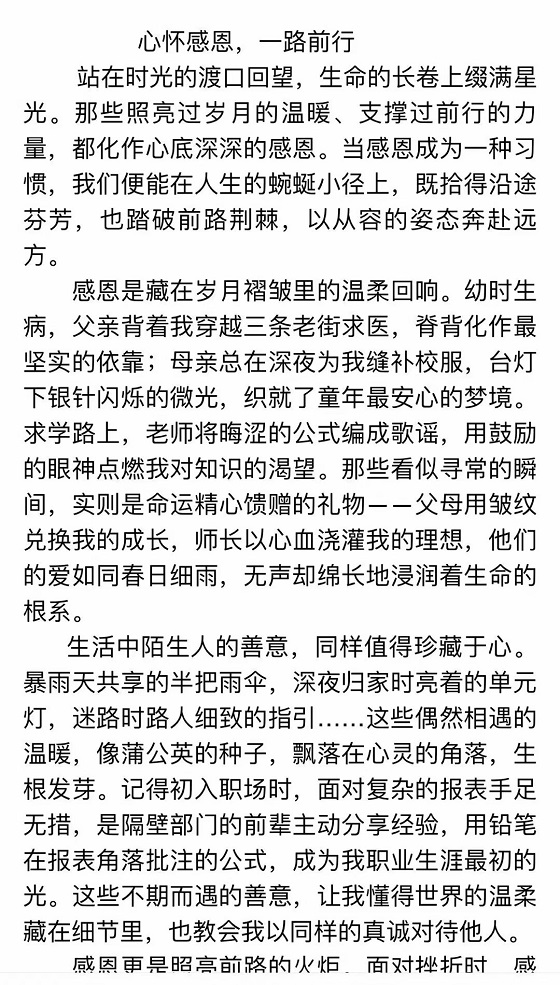 本次活动旨在帮助员工树立正确的个人与社会关系认知,同时构建一个融合感恩教育与心灵成长的平台。活动伊始,主持人在网上宣传动员,员工积极报名参与。活动过程中,员工执笔抒怀,将感恩之情倾注于字里行间,书写父母深夜守候病榻的温暖,记录老师循循善诱的谆谆教诲,描绘朋友雪中送炭的真挚情谊。这些真挚的文字,把家人的养育之恩、老师的教育之情、朋友的帮助之义都变成了珍贵的回忆。这些征文作品充满对生活的感悟,体现出对感恩的独特理解。活动最后,员工纷纷表示,通过本次活动,真切感受到亲友的关爱与付出,学会了感恩与回馈,让心灵得到净化。至此,本次活动圆满结束。